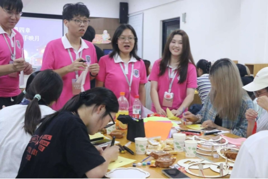 晚会以“明月共此时”温情开场,迅速拉近彼此距离。随后的“月”组联盟破冰环节,同学们凭借抽取的卡片寻找“同馅”伙伴,组建起“嫦娥后援团”等各具特色的队伍,并通过自我介绍与团队口号展示,瞬间点燃现场活力。“月语无声”猜词竞技中,手势翻飞、默契传递,将中秋典故化为生动演绎,欢笑声与掌声不绝于耳;“巧手映月”花灯DIY环节,同学们以笔绘情、以纸传意,一盏盏独具匠心的花灯不仅照亮了场地,更映衬出学子对传统节日的创意诠释与文化认同。