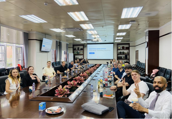 6月19日中午,taptap点点官方网站及国际交流与合作处联合举办的2024-2025第二学期期末外籍教师教学工作专题研讨会在明德楼顺利举行。研讨会汇聚了来自美、英、加、法、日、韩、西、埃、俄等9个国家的22名外籍语言教师,由公外部教研室主任李立主持。副院长刘建珠(主持工作)、国际处项目专员陈晓多、公外部教学秘书韦晗靖、商务英语和小语种教学秘书符桢等全程参与。
